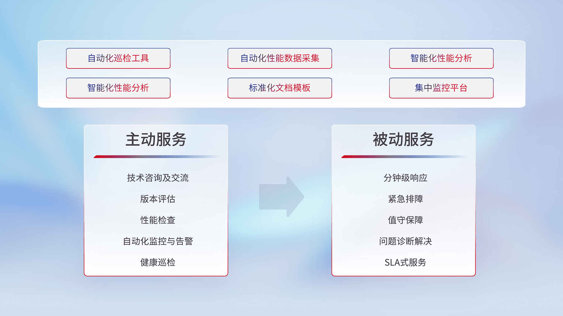 智能化工具和标准化文档,,保障服务质量,,,,提供主动服务(包含技术咨询、、版本评估、、、性能检查、、自动化监控与告警、、健康巡检)和被动服务包含(分钟级响应、、、、紧急排障、、值守保障、、、、问题诊断解决、、、、SLA服务)。。